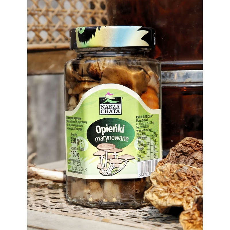Składniki: opieńka miodowa (56%), woda, ocet spirytusowy, cukier, cebula, marchew, sól, przyprawy aromatyczne (pieprz, ziele angielskie, liście laurowe, gorczyca)